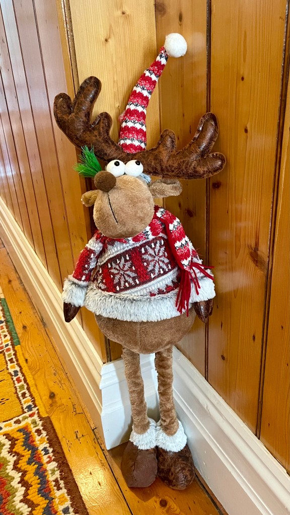 Colin came home with him a few days before Christmas some years back. He’d been out running errands (Colin, not the stuffed reindeer) and wherever the contents of his list had taken him that day, it was an encounter that resulted in an impulse purchase.